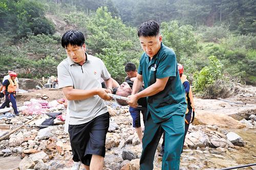 8月2日,消防戰士正在幫助轉移朱家溝村村民。王立群攝