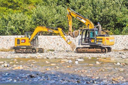 8月1日,在灤平縣馬營子滿族鄉受災地區,挖掘機正在跨河運送電纜。王宏飛攝