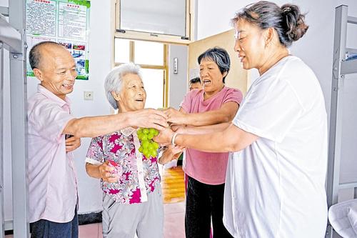 8月1日,興隆二中安置點,朱家溝村村民史春華(右一)把清洗好的葡萄分給鄰居。本報見習記者 張 昊攝