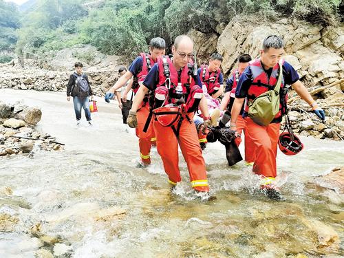 7月31日,救援隊員們從朱家溝村轉移行動困難村民。 本報記者 孫也達攝