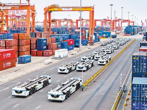 近日,唐山港京唐港區,集裝箱碼頭堆場上智能平板運輸車整裝待發。 本報記者趙杰攝