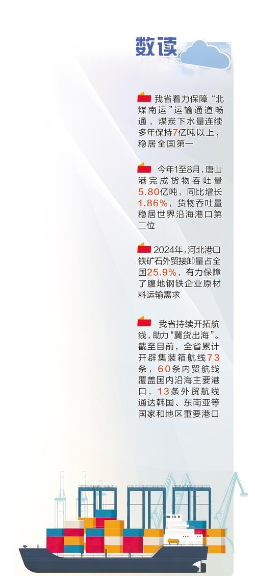 保障“北煤南運”運輸通道暢通,煤炭下水量連續多年保持7億噸以上,穩居全國第一﹔作為世界級大港,唐山港貨物年吞吐量穩居世界沿海港口第二位﹔助力“冀貨出海”,全省累計開辟73條集裝箱航線,外貿航線通達韓國、東南亞等國家和地區重要港口……近年來,河北沿海港口活力澎湃,向海發展、向海圖強新潮涌動。