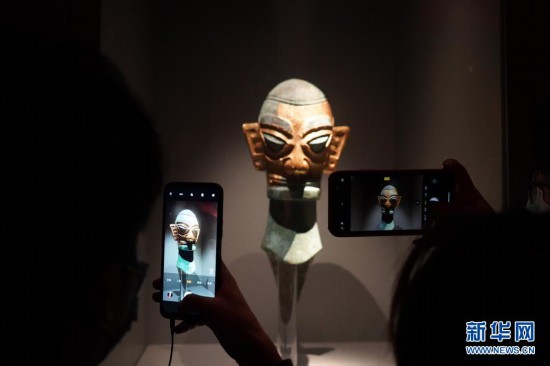 4月3日,参观者在三星堆博物馆参观金面铜人头像。